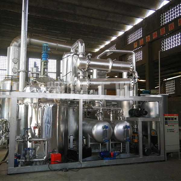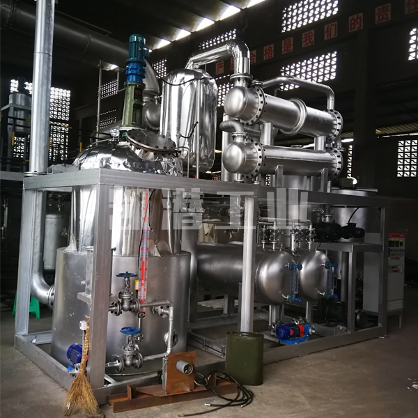 3.1 采用高真空刮膜蒸發(fā)器,分離程度高,遠高于傳統(tǒng)蒸餾器。普通的蒸發(fā)器在300℃的時候就開始碳化結(jié)焦,導致回收的油品質(zhì)量明顯下降,且回收率也明顯降低。因廢機油里的膠質(zhì),瀝青,游離碳等雜質(zhì)非常多,所以采用高真空刮膜蒸發(fā)器可有效的防止這些物質(zhì)結(jié)焦,有效保障設(shè)備長期運行的同時還能提高廢油產(chǎn)量。